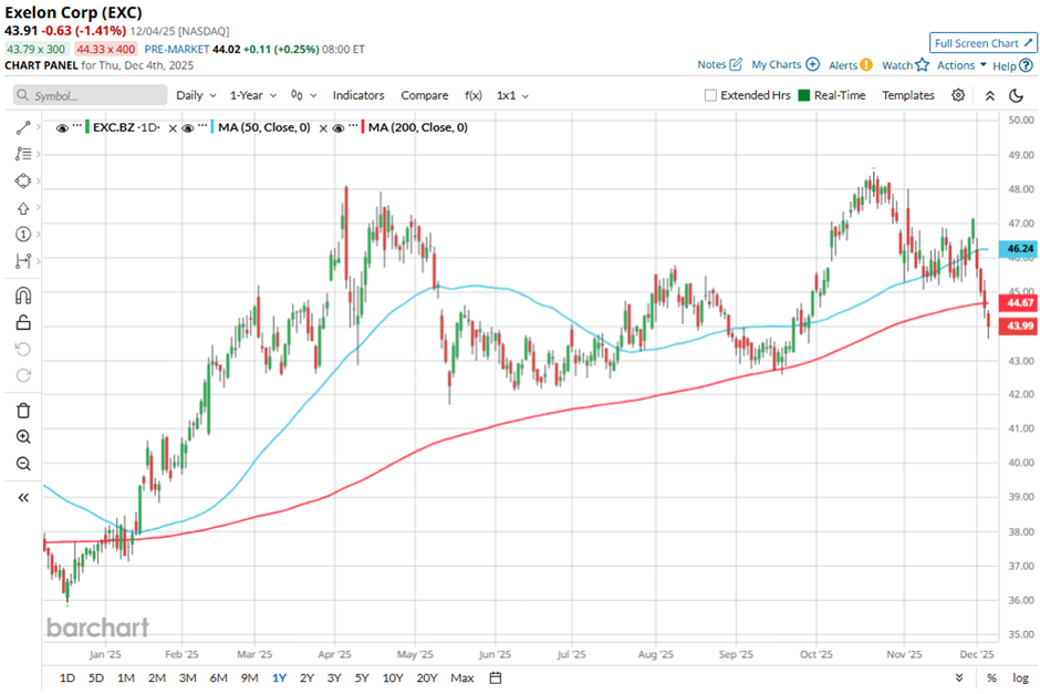 Shares of Exelon rose marginally on Nov. 4 after the company’s report of strong Q3 2025 results, with GAAP and adjusted operating earnings increasing to $0.86 per share from $0.70 and $0.71 per share, respectively, in Q3 2024. Investors were encouraged by Exelon reaffirming its full-year 2025 adjusted EPS guidance of $2.64 - $2.74 and the long-term operating EPS growth target of 5% - 7% through 2028.