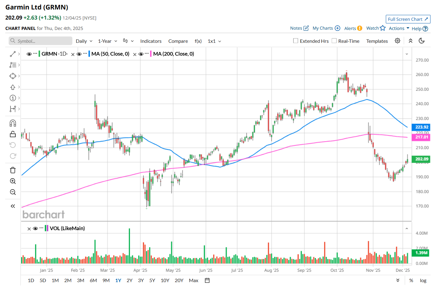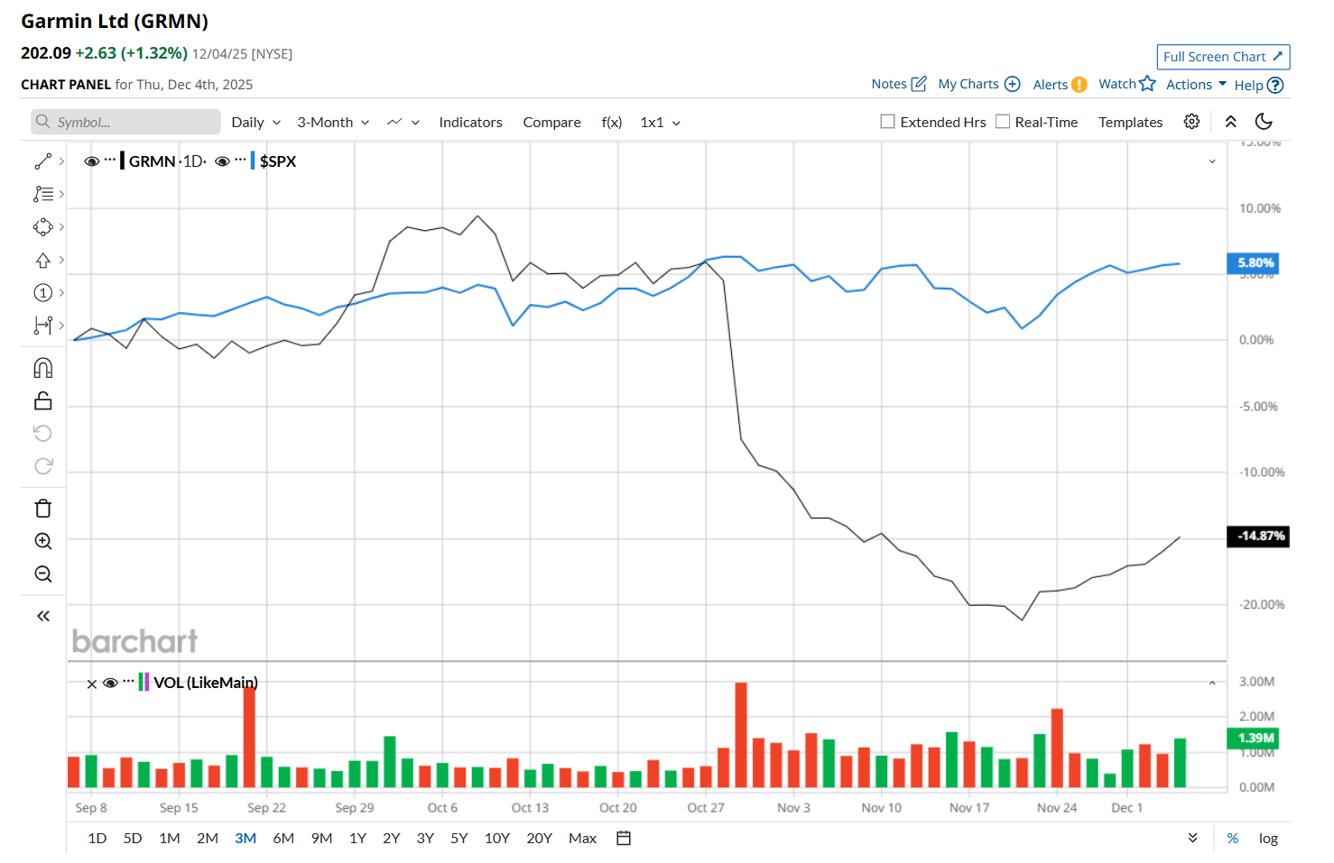 This tech company has slipped 22.8% from its 52-week high of $261.69, reached on Oct. 9. Shares of Garmin have declined 15% over the past three months, considerably underperforming the S&P 500 Index’s ($SPX) 5.5% rise during the same time frame.