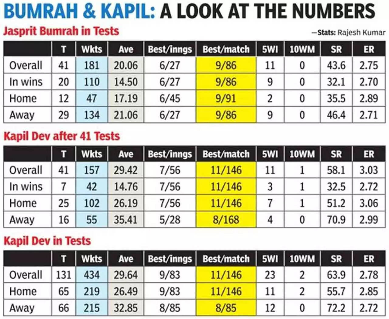 There's no denying the fact that with an average of 20.06 and a strike-rate of 43.6 after 41 Tests, Bumrah's numbers are suggesting that he is way ahead of the pack, including the great Kapil, who finished with a career-average of 29.64 and a strike-rate of 63.9.