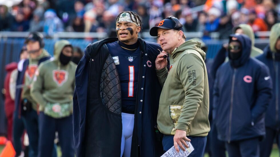 Between the nagging pain of Fields’ separated non-throwing shoulder and the hip injury he played through Sunday — plus who knows what else after getting sacked a league-high 55 times? — there’s plenty of wiggle room for Eberflus and general manager Ryan Poles to go either way on his availability.