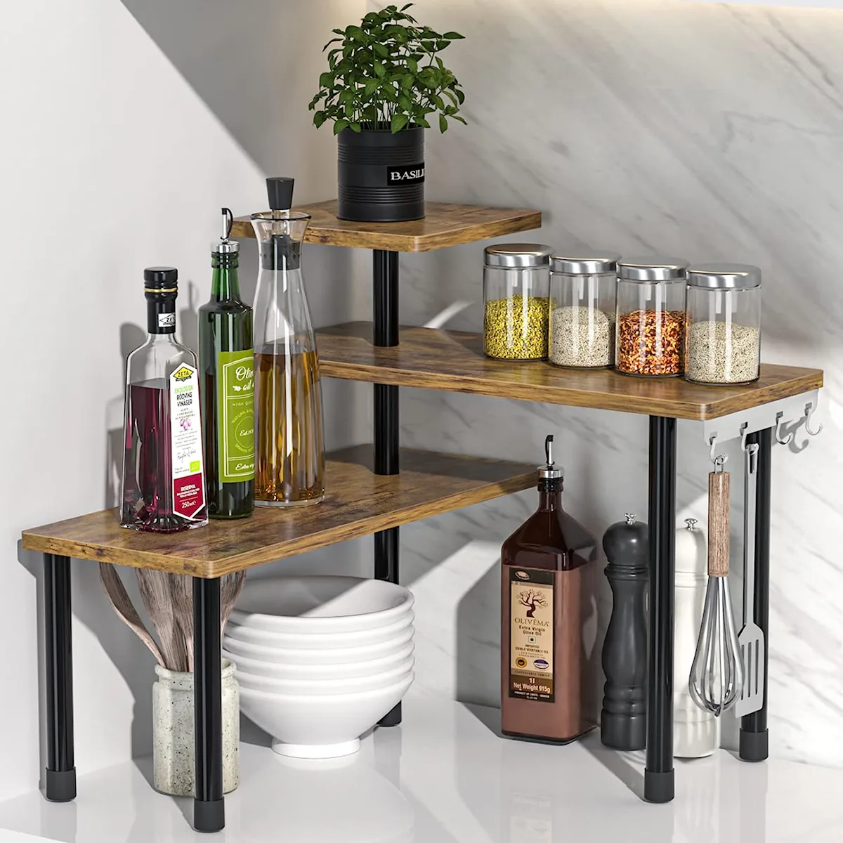 Making good use of the corners in your home is a great way to maximize space, and this tiered corner shelf helps you do it in style. The shelf can be set up in multiple configurations so you can make the best use of your countertops, and it comes with pre-installed hooks so you can hang things from the sides.