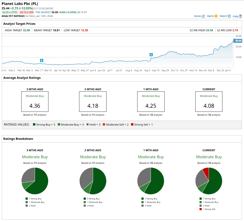 The massive rally in PL stock keeps analysts cautiously optimistic about its prospects. While Planet Labs stock has a “Moderate Buy” consensus rating, growing government contracts, a rapidly expanding backlog, improving profitability, and a highly recurring revenue base make it a compelling investment.