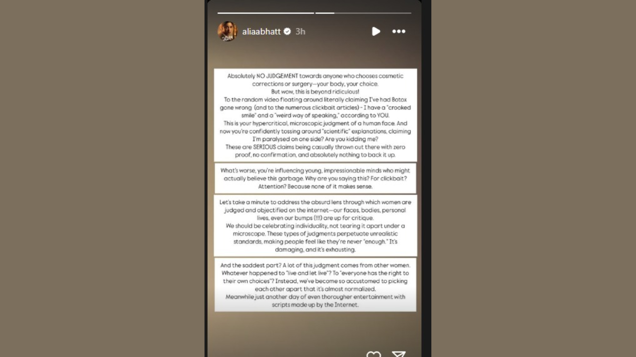 Recently, Alia Bhatt was targeted for having botox treatment. While no update was given by the actor herself, her facial features, the way she spoke at certain events made her a subject of ridicule. Taking to social media platform Instagram, Alia wrote: "Absolutely NO JUDGEMENT towards anyone who chooses cosmetic corrections or surgery-your body, your choice. But wow, this is beyond ridiculous! To the random video floating around literally claiming I've had Botox gone wrong (and to the numerous clickbait articles) - I have a "crooked smile" and a "weird way of speaking," according to YOU. This is your hypercritical, microscopic judgment of a human face. And now you're confidently tossing around "scientific" explanations, claiming I'm paralysed on one side? Are you kidding me? These are SERIOUS claims being casually thrown out there with zero proof, no confirmation, and absolutely nothing to back it up."