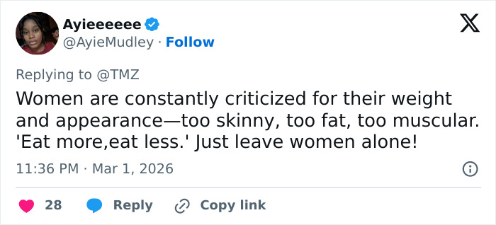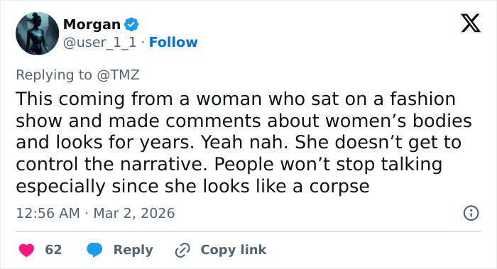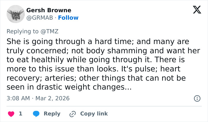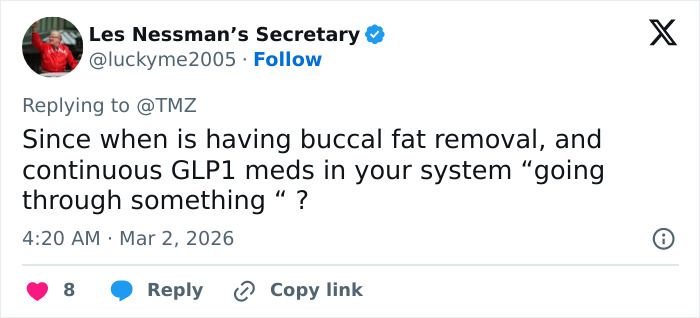 “I am not sure if it is O*empic, plastic surgery, or a*orexia, but she looks very unhealthy. I hope she is getting help,” wrote one user.