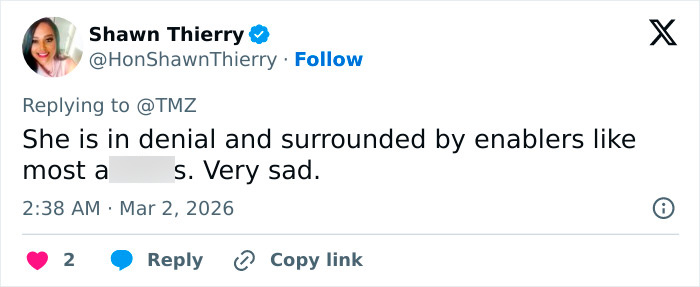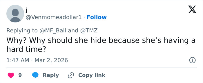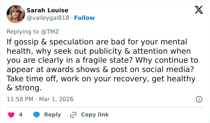 In a December 2025 statement shared on social media, she wrote, “I am ill right now. My life is completely flipped upside down… The fact that I’m getting out of bed and facing my life — trying — should be more than enough.”