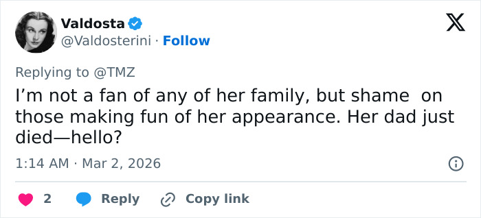 Her mother, Sharon, publicly defended her during an interview on Piers Morgan Uncensored, saying, “She’s not happy, she’s lost her daddy… she can’t eat right now.”