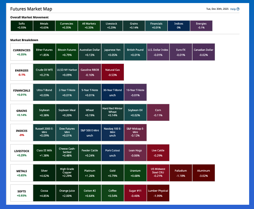 Morning Summary: Naturally, the first thing I noticed Tuesday morning was the rebound in Metals following Monday’s meltdown by the sector. As of this writing, silver’s Cash Index (SIY00) had rallied as much as $3.02 (4.2%) while the Cash Index for gold (GCY00) added as much as $50.62 (1.2%). Even Dr. Copper, the economic indicator, played along as the March futures contract (HGH26) gained as much as 17.9 cents (3.2%) overnight. Was this nothing more than a little Turnaround Tuesday activity, or was there something more to the move? I would argue it’s the latter, based on lead stories on CNBC’s program Squawk Box Europe indicating two of the 3 Amigos are mad. Leading off, the US president was again making threats to fire, if he could, US Fed Chairman Powell because interest rates aren’t coming down fast enough, the US dollar hasn’t fallen far enough[i]. Sure…Next we have Russia’s Vlad the Invader reportedly threatening retaliation against Ukraine for an alleged attack on one of his personal residences. Again, though, the “evidence” of such an attack seems to be lacking. All we need now is China’s President Xi to get upset with Taiwan, and the trifecta will be complete. Global equity markets are mixed with Asia closing lower and Europe trading higher.