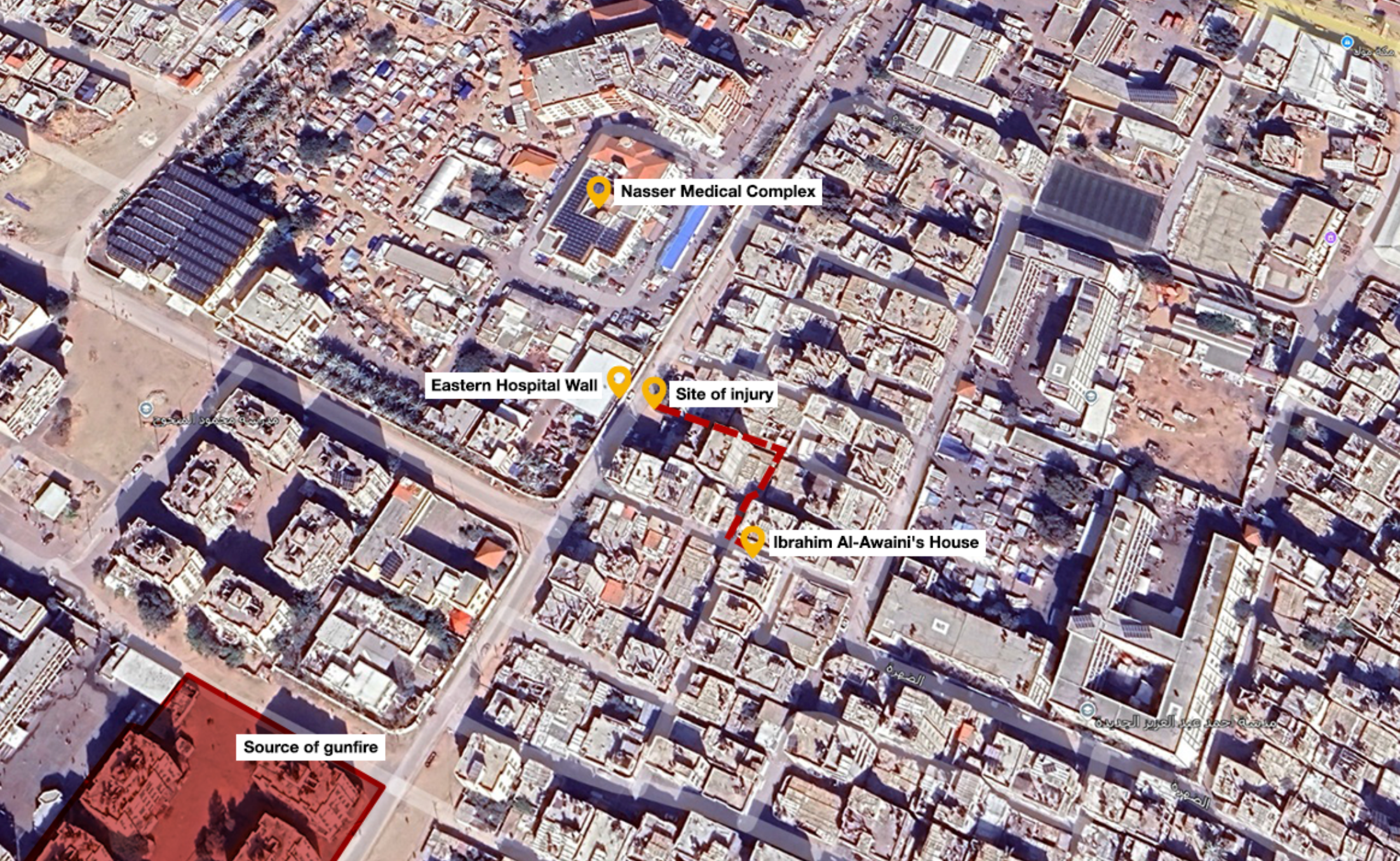 Euro-Med Monitor examined sight lines from nearby elevated structures to assess possible firing angles and compared these with injury sites.