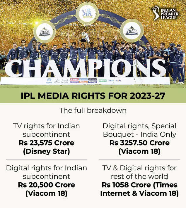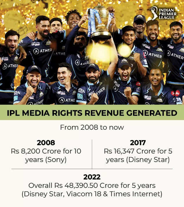 2022: Disney Star bid Rs 23,575 Crore for TV rights in India alone --- Viacom 18 bid Rs 20,500 Crore for Digital rights in India alone --- Times Internet and Viacom 18 bagged the Rest of the World TV and Digital rights (Middle East & North Africa, US, UK, Australia-NZ, South Africa) - Total media rights revenue which will be collected over 5 years - Rs 48,390.5 Crore