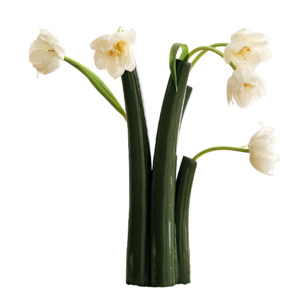 This striking vase is designed to highlight single tulip stems rather than a full, blousy bunch, and is available in a natural green or an organic cream. The tulips enhance their sculptural quality as they gracefully droop, creating a simple yet elegant display.