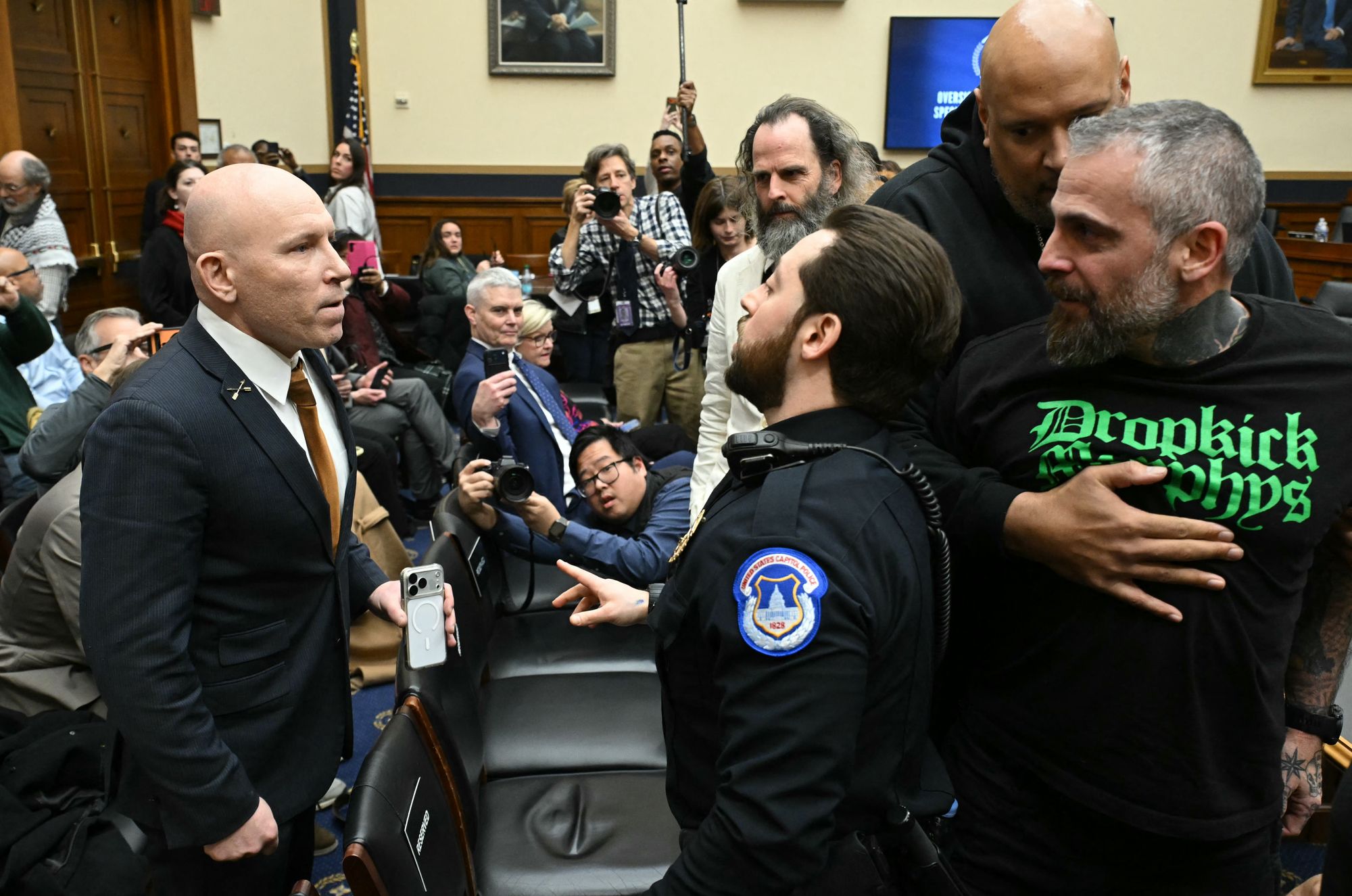 Fanone — wearing a T-shirt repping band the Dropkick Murphys with the slogan “fighting Nazis since 1996”— was dragged down the Capitol steps, beaten with pipes and threatened with his own gun as a mob surrounded him on January 6, 2021. Fanone suffered a heart attack after the riot.