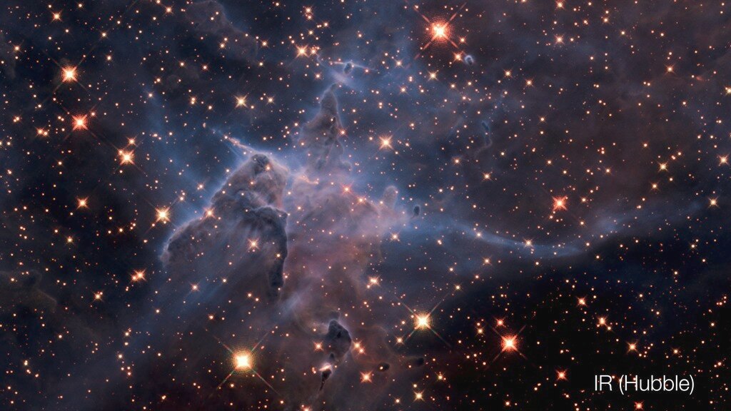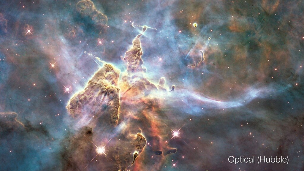 A set of Hubble images released in 2018 show what it looks like in optical light (the light we see with our eyes), and in near-infrared light, which can cut through dust in the pillars to see new stars.