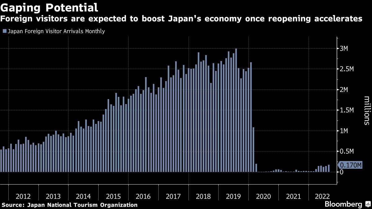 As one of the last remaining rich economies to reopen for tourism, there’s anticipation of an economic lift that could eclipse the pre-pandemic travel boom. Inbound spending could rise by 32% to 6.6 trillion yen ($45.4 billion) annually after a full reopening compared with 2019, according to a recent report by Goldman Sachs economists.