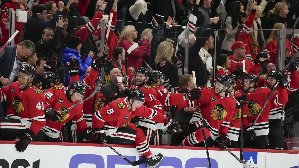 The Maple Leafs’ William Nylander nearly ruined the party when he rang the puck off both posts and the crossbar on a breakaway, but Hawks rookie Kevin Korchinski ignited the United Center by jamming in a loose puck with 30 seconds left after it had bounced over the top of the net.