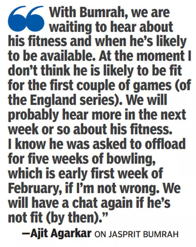 Bumrah had suffered back spasms during the recent Sydney Test against Australia but the Agarkar-led panel is not ready to give up on him yet. Agarkar, however, made it clear that Bumrah will only be considered for selection from the third match of the ODI series against England, in Ahmedabad on Feb 12. "We are waiting to hear about his (Bumrah's) fitness, so Harshit Rana will be part of the One-Day squad against England right now. At the moment, I don't think Bumrah is likely to be fit for the first couple of games," Agarkar said.