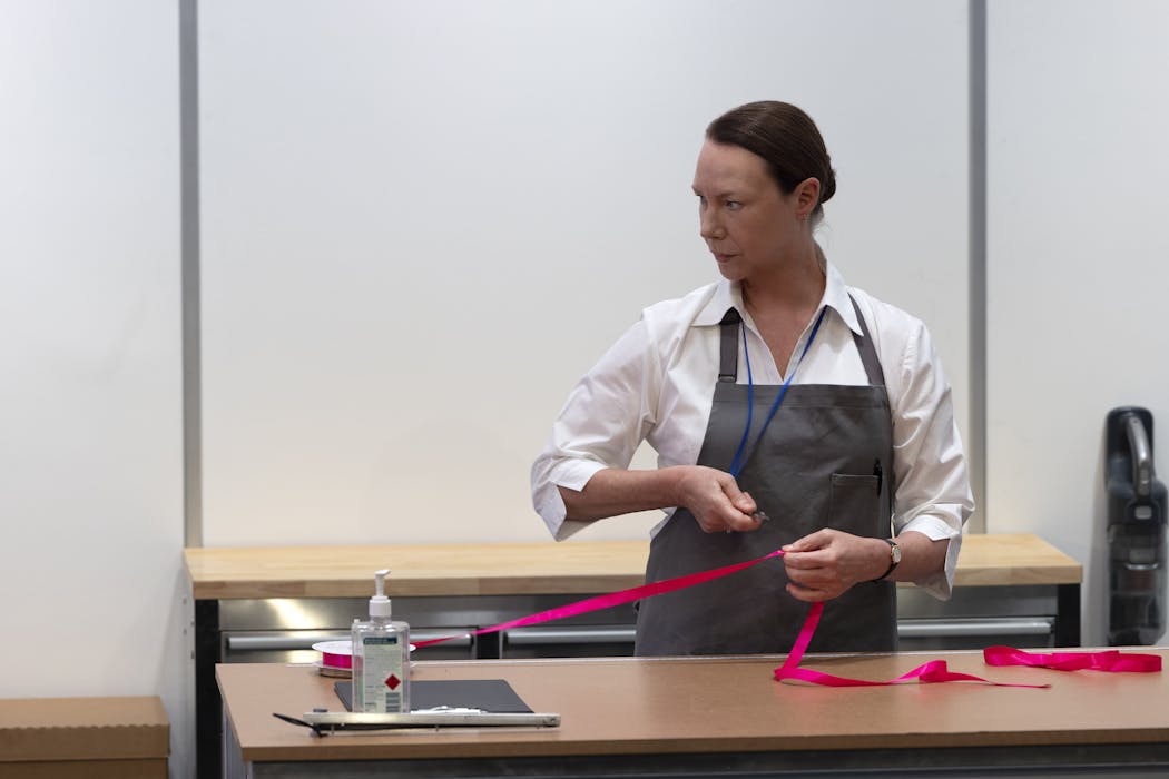 Tong allows the narrative to unfold at a deliberate, contemplative pace. Katy Maudlin’s direction is considered and deft. Time stretches and folds in on itself; days and months blur together in the purgatory of workplace monotony. Boxes arrive through a mysterious “box door”. Penny and Flux methodically open, catalogue and repack their contents. Pool floaties are inflated and deflated. Ribbons are measured and cut. Plastic fir tree Christmas ornaments are checked and counted.
