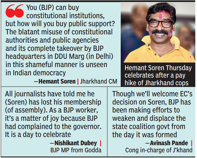 Raj Bhavan officials said the EC had found the complaint about Soren owning a mining lease while in government a fit case for disqualification from assembly membership under Section 9A of the Representation of People Act, 1951. Till late Thursday, governor Ramesh Bais hadn't officially announced either the poll panel's recommendation or how he proposed to go about executing it.