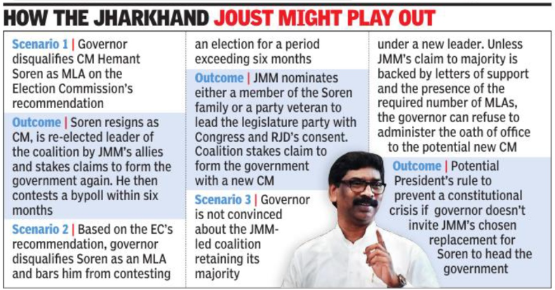 JMM said it would move the Supreme Court if CM Soren was disqualified as an MLA. Chief spokesperson Supriyo Bhattacharya said there was no immediate threat to the government given the fact that the JMM-Congress-RJD coalition had an absolute majority of 49 in the 81-member assembly. JMM, with 30 MLAs, remains by far the strongest constituent and most likely to have the last word on Soren's replacement in the event of him being barred from contesting elections. Congress has 18 MLAs, three of whom are dissidents arrested in Bengal's Howrah with cash allegedly meant to be used in destabilising the government.