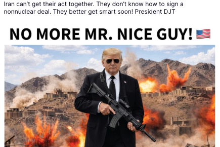 The image the president posted in the early hours of Wednesday morning featured Trump in hit man guise posing in front of a bomb-struck Middle Eastern hillside backdrop with the slogan: “No more Mr Nice Guy!”