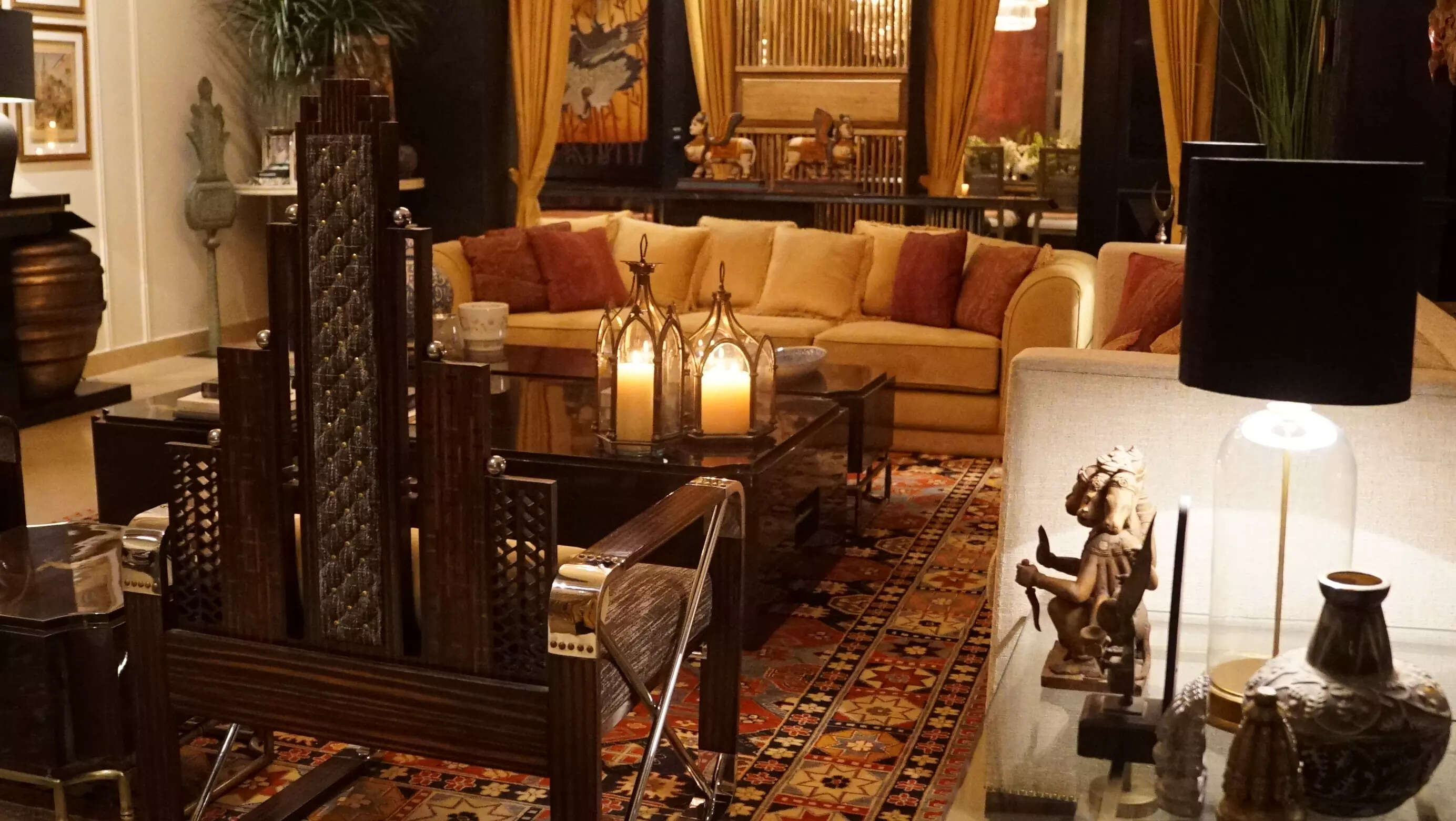 The designer made use of his signature chevron pattern in doing up the walls and the flooring. The beautiful Art Deco-inspired staircase led to a grand chandelier with walls fabricated using original and antique Jamawar shawls.