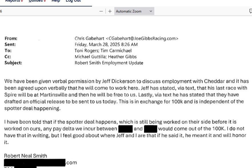 Rogers shared, as an exhibit, an email with Chris Gabehar that did confirm the $100,000 figure Dickerson reference but nothing to indicate that JGR had the option to let a car chief or crew chief out of their contract to leave for Spire.