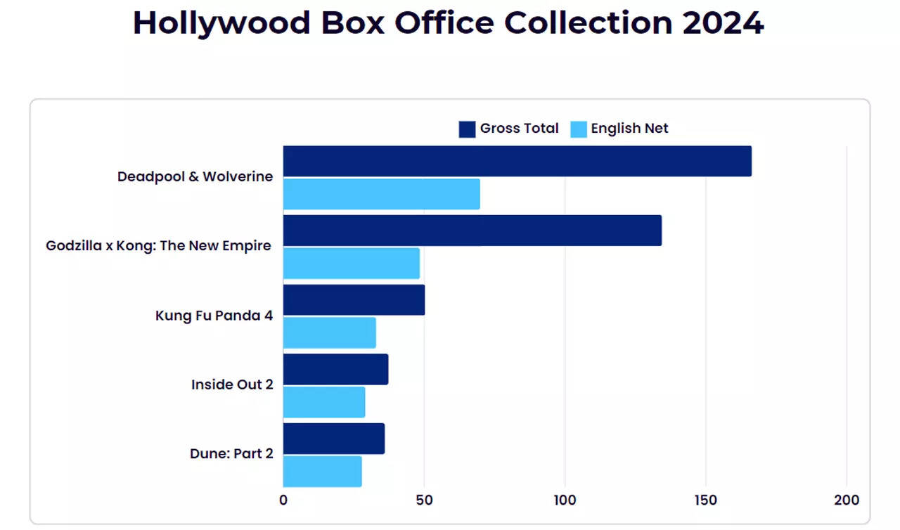 A Dismal Year So FarAs of 2024, Hollywood films have grossed a total of Rs 318.33 crore in nett collections and Rs 574.88 crore in gross collections in India. This is a stark contrast to the previous year, 2023, when Hollywood films raked in Rs 648.22 crore in nett collections and Rs 1043.8 crore in gross collections. The decline is even more evident when compared to 2022, a year that saw earnings of around Rs 580.04 crore net and Rs 1054.4 crore gross in India.