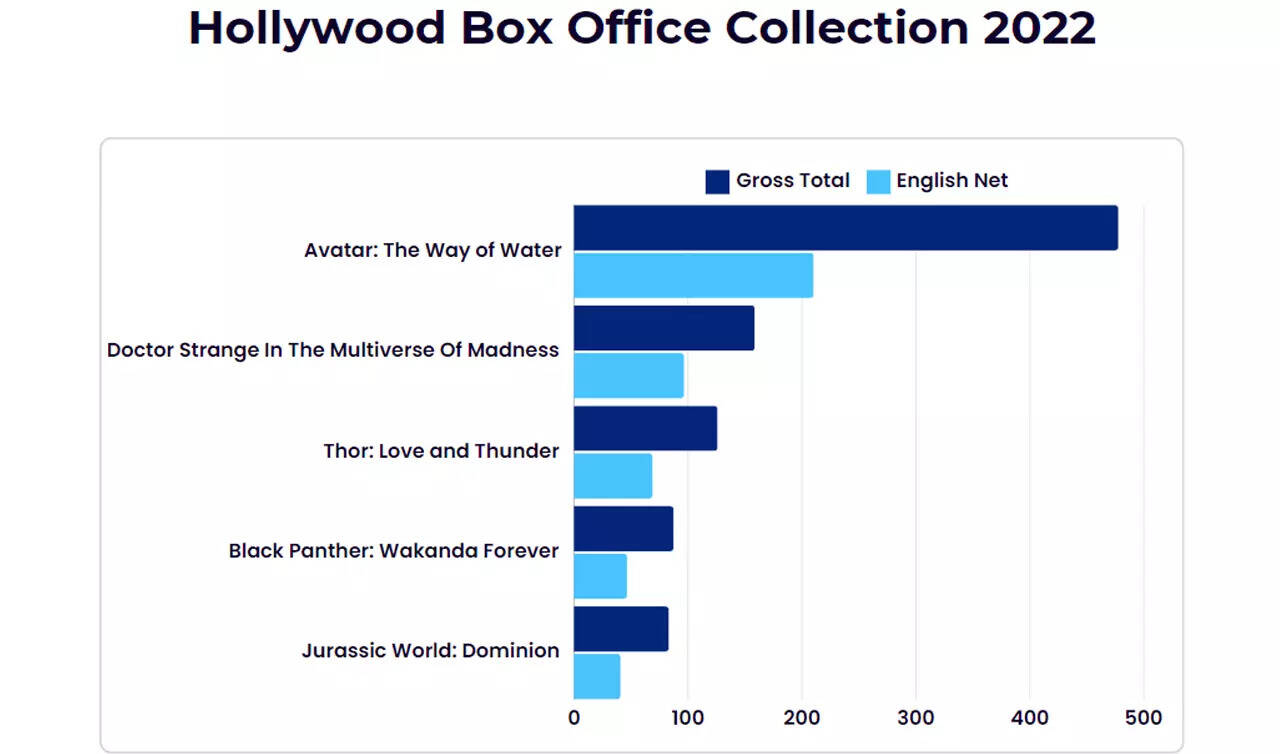 Hollywood films saw a resurgence in India on 2022, driven by the release of major blockbusters. The total English net collection almost doubled to Rs 580.04 crore, with a gross of Rs 1054.4 crore. This year saw three films crossing the Rs 100 crore mark, led by James Cameron's 'Avatar: The Way of Water' which dominated the box office with a staggering nett collection of Rs 210.33 crore and a gross of Rs 477.5 crore. The film's success was linked to the enduring appeal of Cameron's epic, especially in south markets contributing significantly to its all-India numbers.