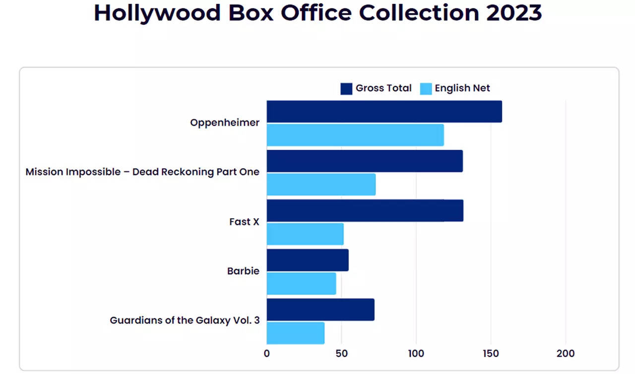 2023 was a year when big names and established franchises took centre stage, pushing Hollywood's box office collections to impressive heights. The total English net collection for the year reached Rs 648.22 crore, with a gross of Rs 1043.8 crore. Christopher Nolan's 'Oppenheimer' emerged as the highest-grossing Hollywood film in India, with an English nett collection of Rs 118.62 crore and a gross total of Rs 157.5 crore. The film's success highlighted Nolan's strong fanbase in India and the continued appeal of historical and biographical narratives. Interestingly, India was one of the few markets where 'Oppenheimer' beat Greta Gerwig and Margot Robbie's 'Barbie' at the box office.