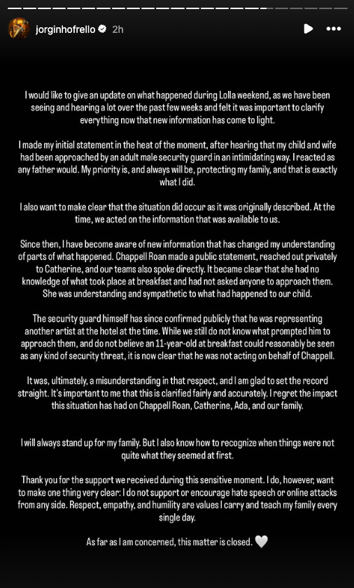 Nearly a month after the viral incident sparked a wave of backlash against Roan, 28, soccer star Jorginho Frello issued a statement Monday to clear up the situation, which occurred during Lollapalooza weekend in Brazil.