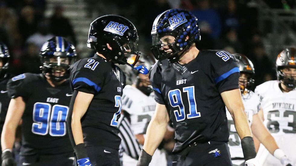 Lincoln-Way East junior Caden O’Rourke is one of the state’s most devastating defenders. The 6-5 defensive end was too much for Minooka to handle on Friday in Frankfort, leading the Griffins to a 28-0 win in the second round of the Class 8A state playoffs.