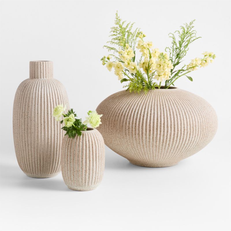 This elegantly fluted vase is crafted from earthenware and finished by hand with a reactive volcanic glaze in a soft mushroom hue. The generous smattering of speckles adds organic warmth that complements the rhythmic ribbing. Available in three sizes, it's perfect for the kitchen, whether used to display herbs, small blooms, or as part of an eclectic countertop arrangement.