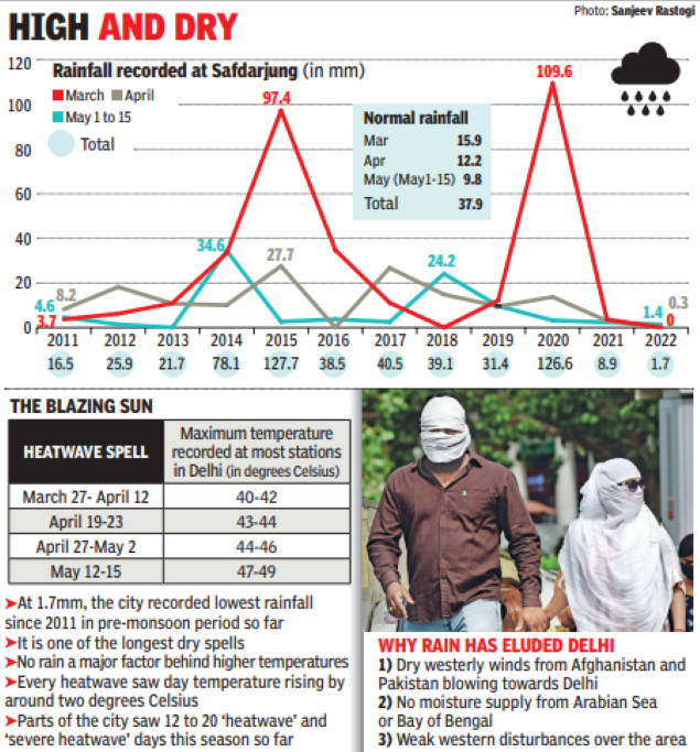 The IMD’s data shows not a single day in March received rain. In April, the city logged 0.3mm rainfall with just one rainy day on April 22. Similarly, May so far saw just one rainy day on May 5 with 1.4mm rainfall. In 2021, Safdarjung received 8.9mm rain between March 1 and May 15, while the corresponding figure for 2020 was 126.6mm.