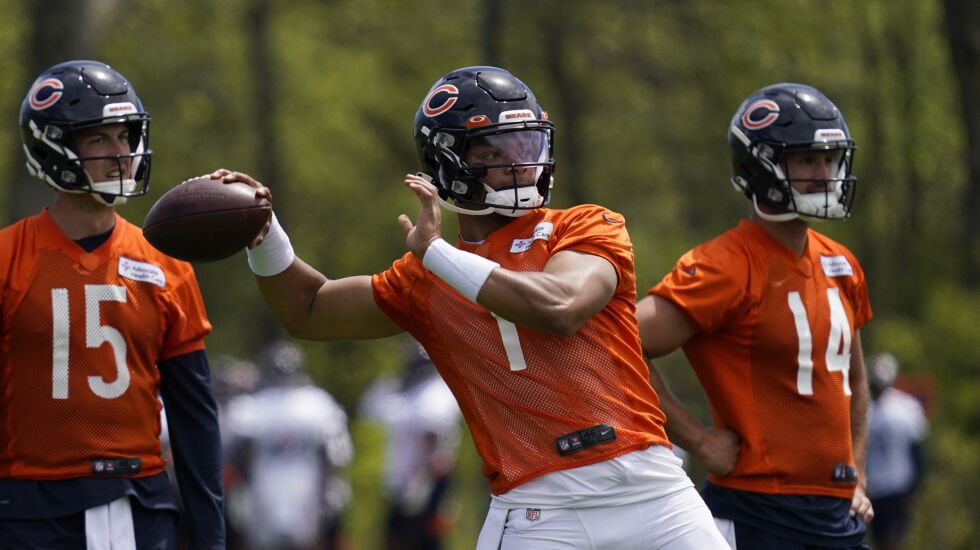 ‘‘He’s doing a good job; he’s right on schedule,’’ Eberflus said when asked about Fields’ development. ‘‘We feel great about where he is. Footwork is clean. Operation’s getting better every day, and we’re just taking one step at a time.’’