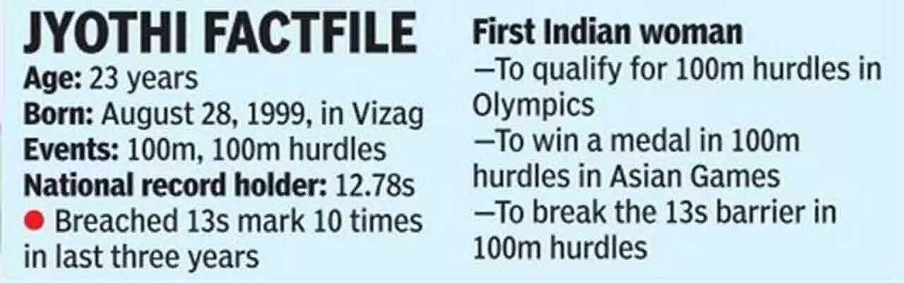 The reigning national record holder in the event, Jyothi is also the only Indian woman to win a medal in the women's 100m hurdles at the Asian Games, where she won silver last year. She is the only Indian woman to go below the 13s-mark and holds the 15 fastest times ever run by an Indian in this category.