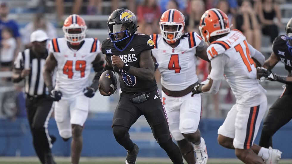 The Illini’s Luke Altmyer threw for 202 yards and a touchdown while running for 70 and two more scores, and he showed some moxie by bouncing back from a crushing blow from Kansas defensive lineman Austin Booker to lead a fourth-quarter rally.