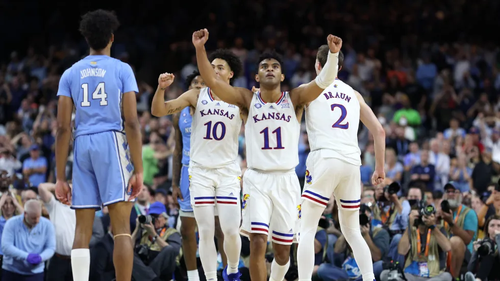 North Carolina missed its final four shots, including Caleb Love’s desperation 3 at the buzzer. His heave came up short after officials ruled that Kansas guard DaJuan Harris Jr., stepped out on an inbounds pass with 4.3 seconds left.