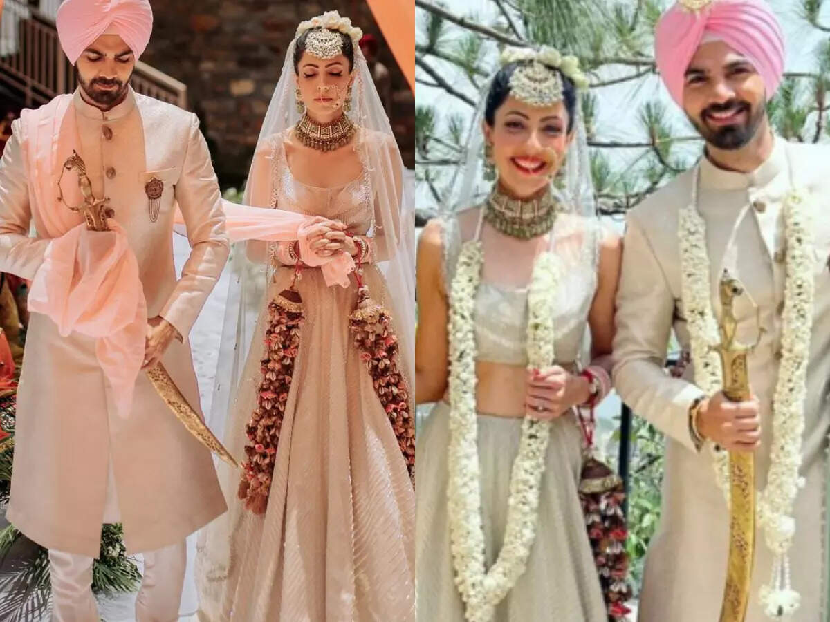 In the dreamy picture, Grover and Jabbal can be seen in colour-coordinating off-white wedding ensembles, with Grover sporting a pink turban and Jabbal pairing her lehenga with traditional precious as well as floral jewellery.