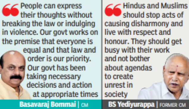 UDUPI/BENGALURU: In near-coordinated statements in a bid to stem the rising tide of targeted hate campaigns, CM Basavaraj Bommai and his predecessor BS Yediyurappa on Monday sent out a strong warning to fringe groups stoking communal tension in the state and said the government will not tolerate if they breached the line.