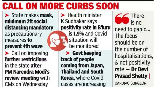 The state will take a call on imposing further curbs after PM Modi's meeting with the CMs of all states on Wednesday. These decisions were made at a meeting chaired by CM Basavaraj Bommai to discuss precautionary measures to be taken to combat the fourth wave of Covid. Health minister K Sudhakar, revenue minister R Ashoka, TAC chief and members attended the meeting.