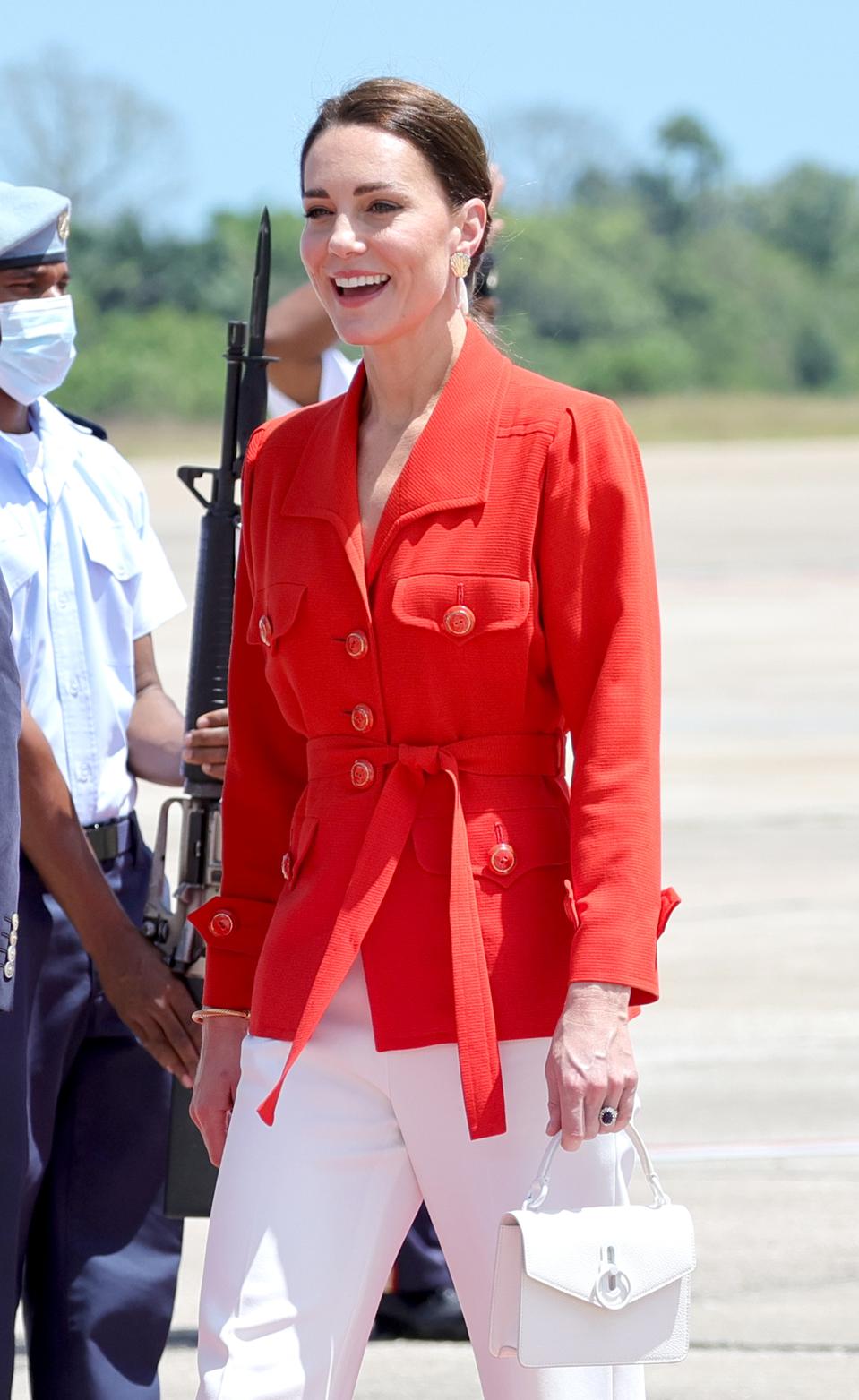For their arrival at Philip S. W Goldson International Airport in Belize to start their royal tour, Kate chose an all-blue Jenny Packham spring suit to pay tribute to the Caribbean country with a matching clutch.