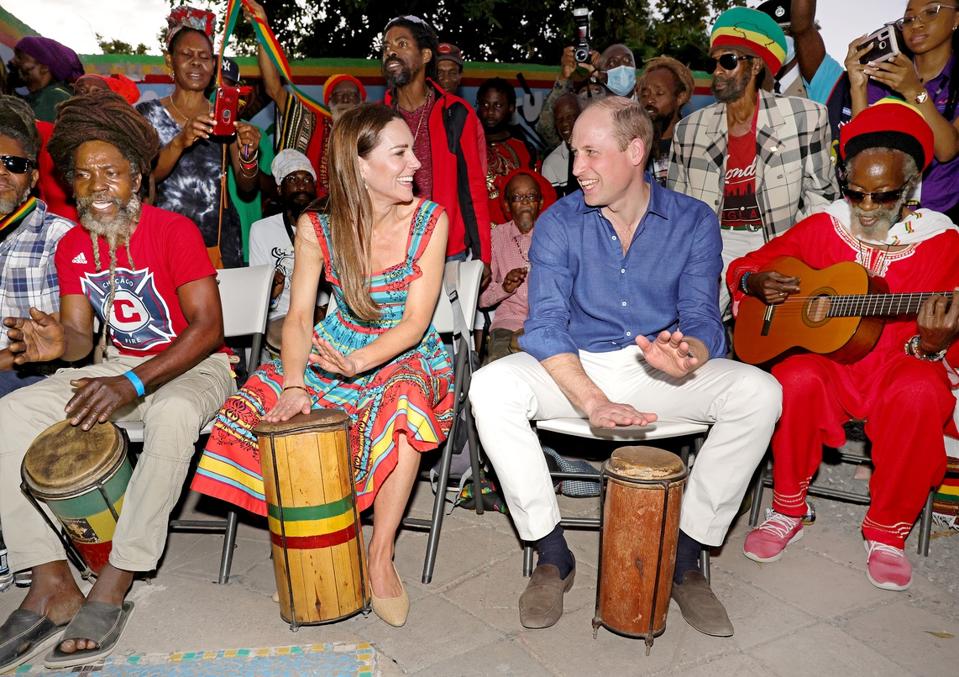 At the Trench Town Culture Yard Museum, home of Bob Marley, the couple joined in live music, playing the drums.