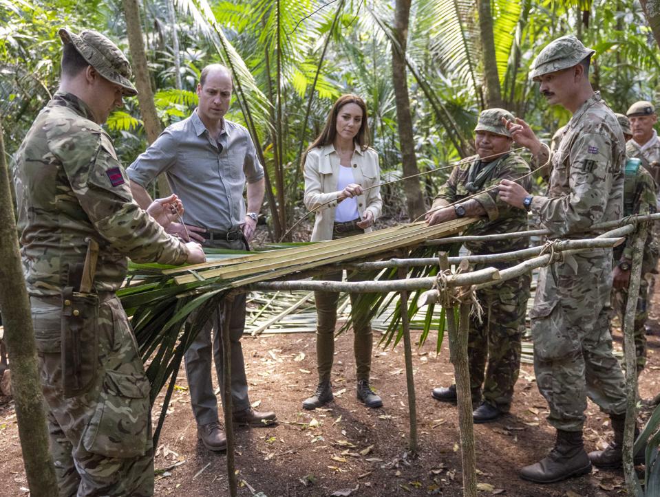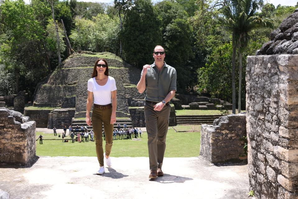They wore casual attire for the visit to ancient Mayan ruins at the Caracol archaeological site in the Chiquibul Forest in Belize.