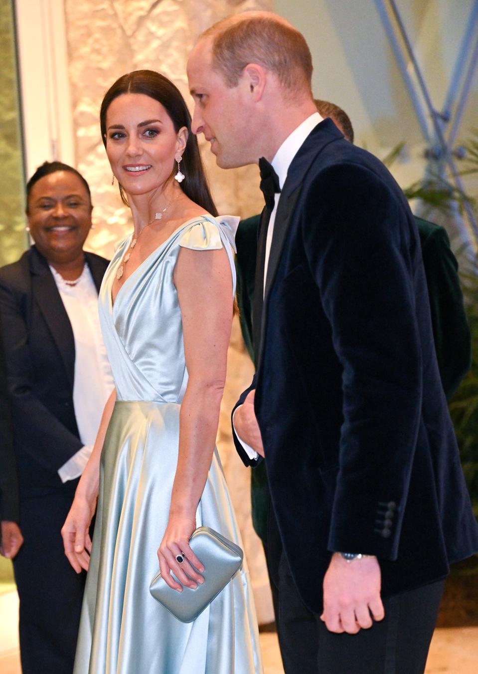 The Duchess wore a shimmering turquoise bespoke silk gown with hand-tied bows at the shoulder from British designer Phillipa Lepley, that paid tribute to her host country's flag. Prince William appeared in a blue velvet tux.