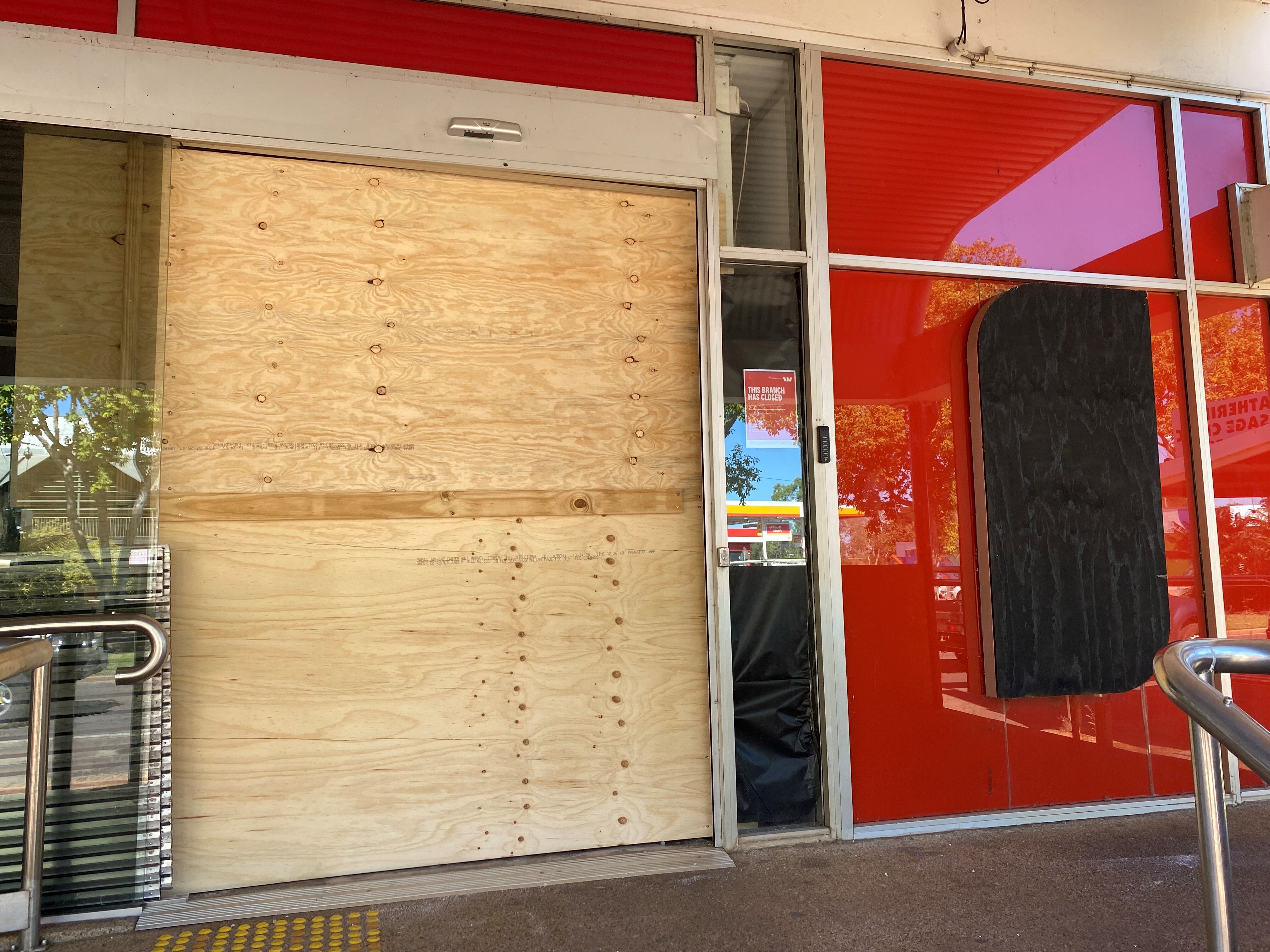Shops, banks, petrol stations, the post office and the entrance to Katherine Central shopping complex all bear the signs of recent property damage.