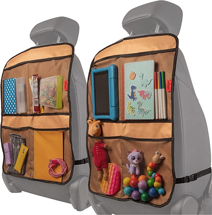 Instead of a pile of toys and other gear that’s constantly on the floor where your kids can’t reach them while buckled up, hang these two kick mats with pockets on the back of the front seats and fill them with entertainment and snacks. Your drive will be a lot calmer. They also keep the back of your seats clean and prevent kick scuffs.