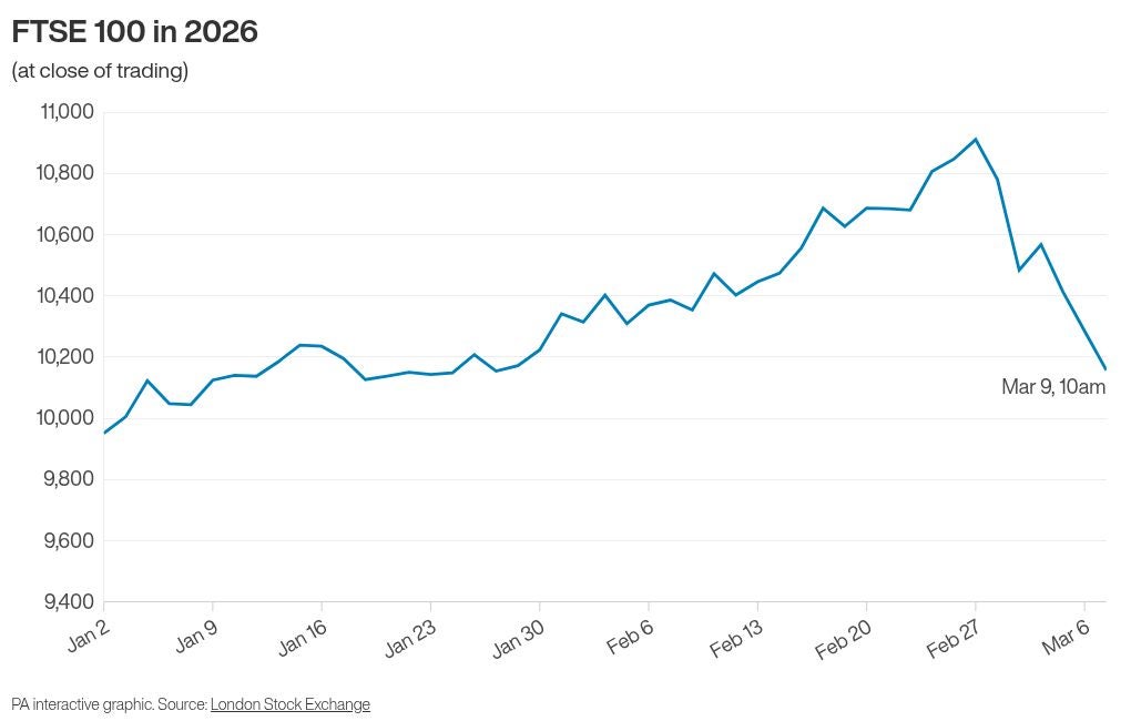 London’s FTSE 100 Index also fell nearly 2 per cent soon after opening, as the Middle East conflict promoted an acute supply crunch.