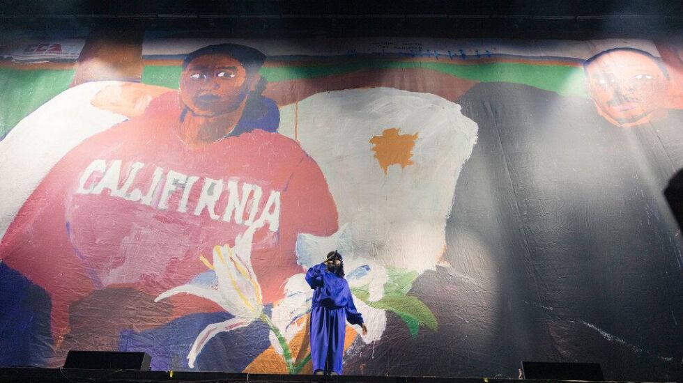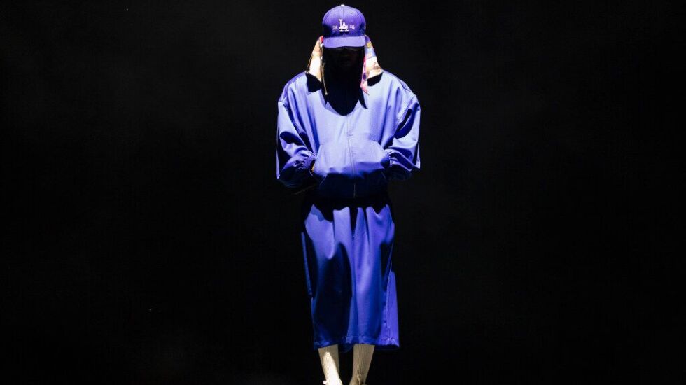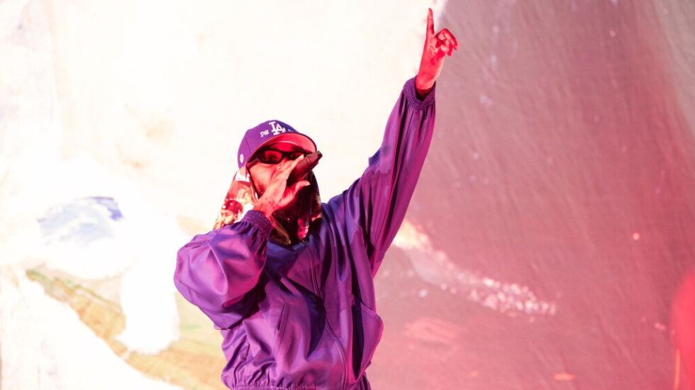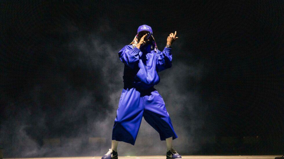 On this night, Lamar was overtly minimalist. He appeared on stage sans any superfluous stage props other than a large mural backdrop in the beginning, some strobes and smoke effects, while wearing a blue jumpsuit and Dodgers-style cap representing pgLAng — his new entertainment company and label he created with Dave Free in 2020.