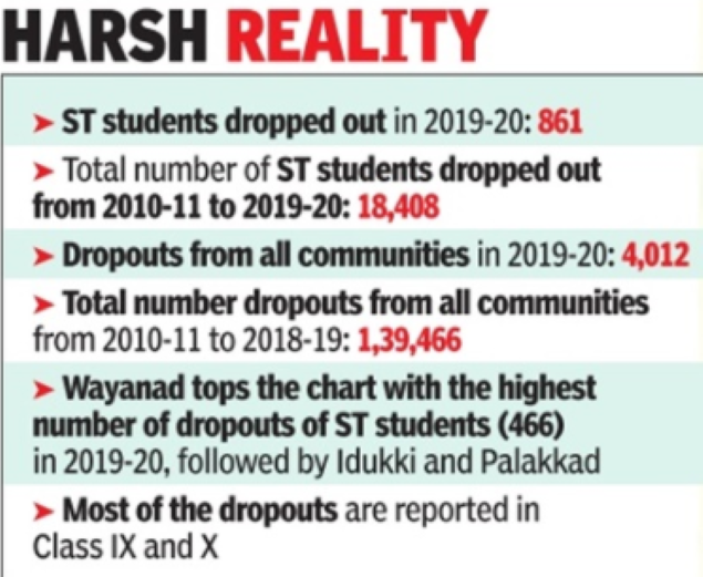 KOCHI: Dropout of students belonging to scheduled tribes continues unabated as 861 ST students dropped out of schools in state during 2019-20 alone, revealed a reply by the general education department to an RTI query. They constitute a whopping 21% of the total dropout of students from all communities in the same year.
