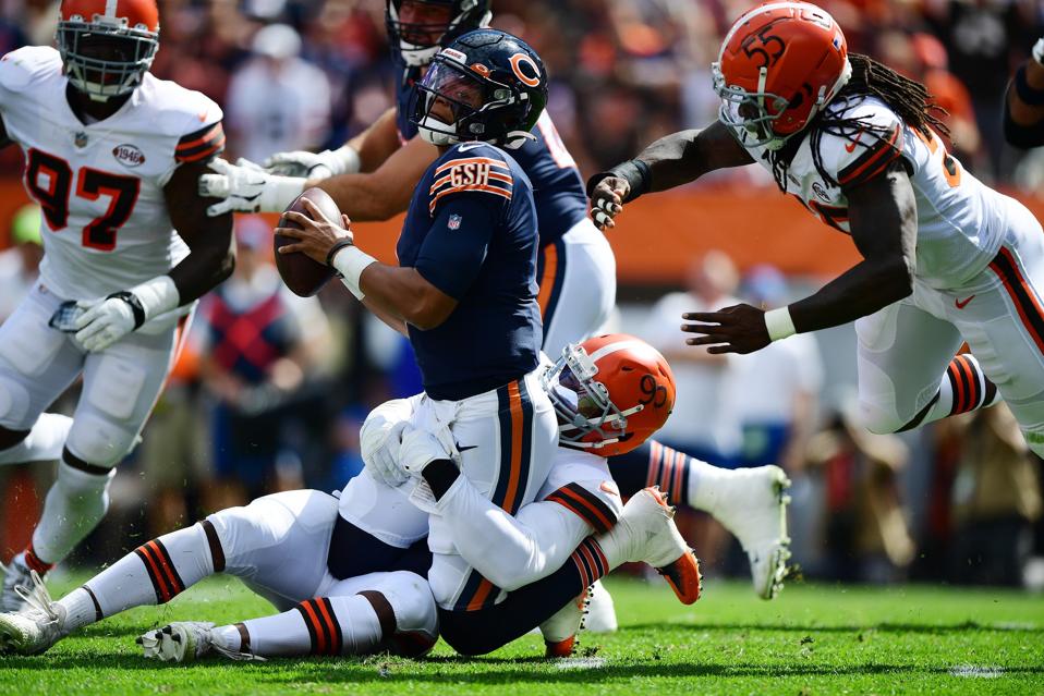 CLEVELAND, OHIO - SEPTEMBER 26: Justin Fields #1 of the Chicago Bears is sacked during the second quarter in the game against the Cleveland Browns at FirstEnergy Stadium on September 26, 2021 in Cleveland, Ohio. (Photo by Emilee Chinn/Getty Images) Getty Images