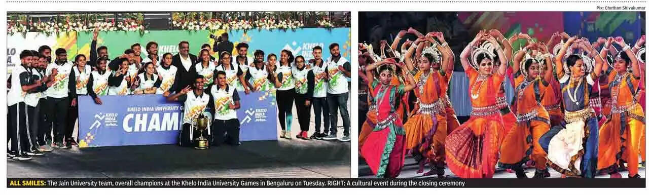 BENGALURU: Hosts Jain University, powered by swimmer Siva Sridhar's collection of 7 gold and two silver, overcame a strong challenge from Lovely Professional University, Punjab, to win the overall championship as the curtain came down on the Khelo India University Games (KIUG) with a colourful closing ceremony here on Tuesday.
